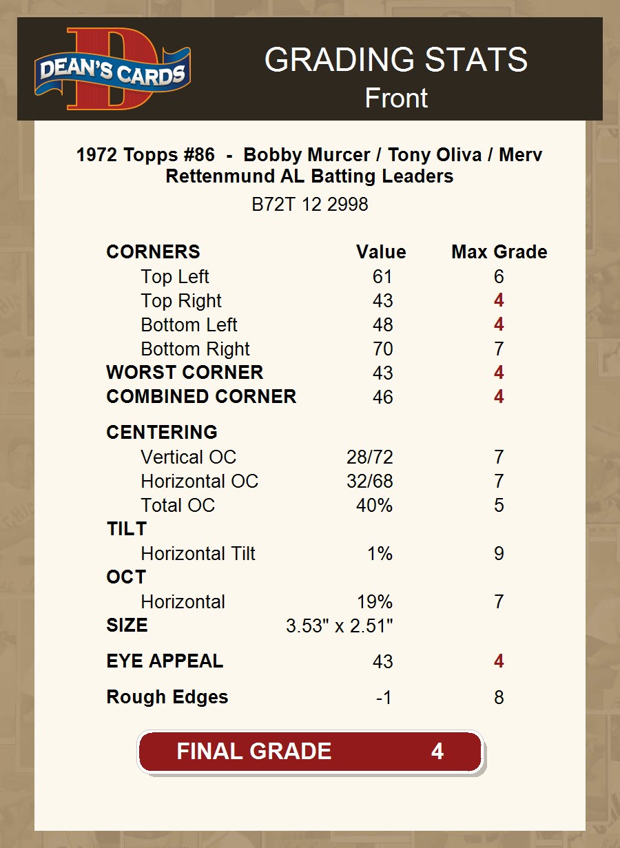 1972 Topps #86 - Bobby Murcer / Tony Oliva / Merv Rettenmund AL Batting Leaders 4 - VG/EX