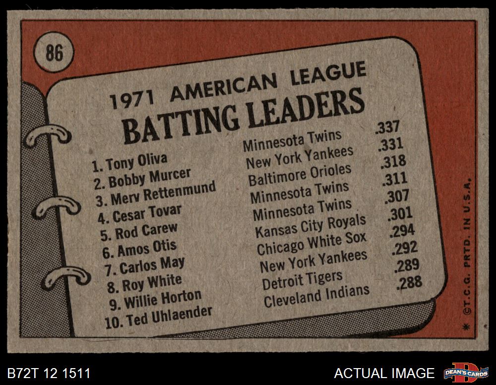1972 Topps #86 - Bobby Murcer / Tony Oliva / Merv Rettenmund AL Batting Leaders 6 - EX/MT