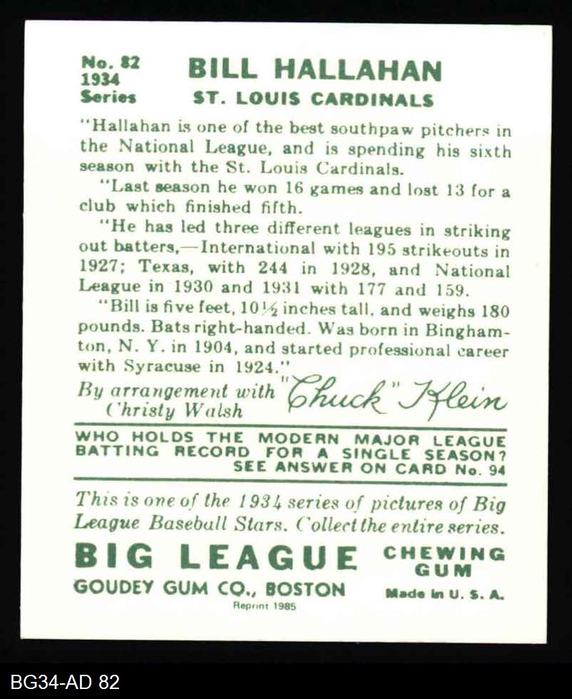 1934 Goudey Reprint #82 Bill Hallahan 8 - NM/MT