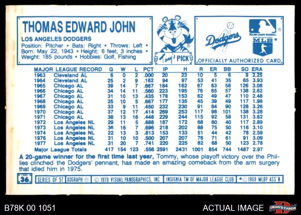 1978 Kellogg's #36 Tommy John 4 - VG/EX
