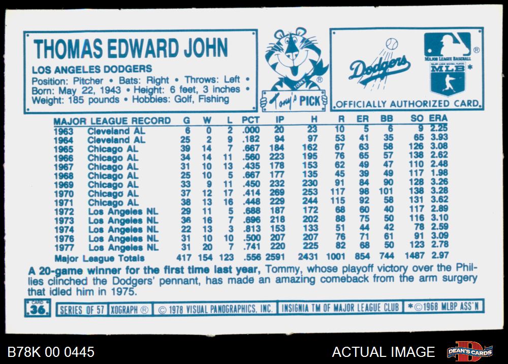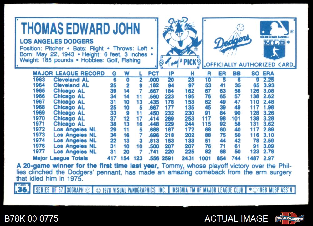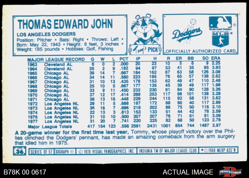 1978 Kellogg's #36 Tommy John 8 - NM/MT