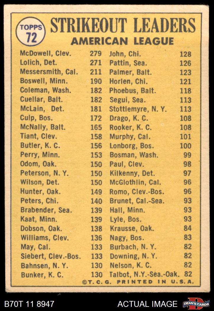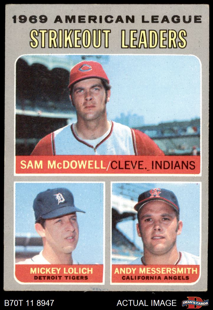 1970 Topps #72 - Mickey Lolich / Sam McDowell / Andy Messersmith AL Strikeout Leaders 4 - VG/EX