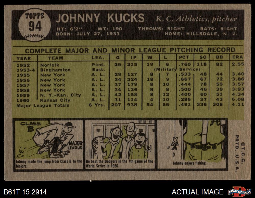 1961 Topps #94 Johnny Kucks 2 - GOOD
