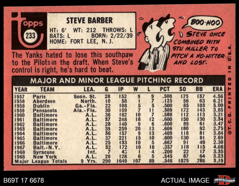 1969 Topps #233 xMUD Steve Barber