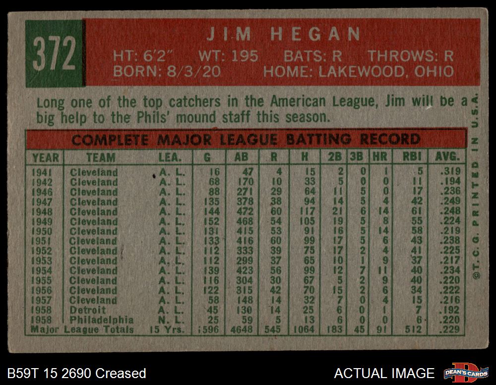 1959 Topps #372 Jim Hegan 3 - VG