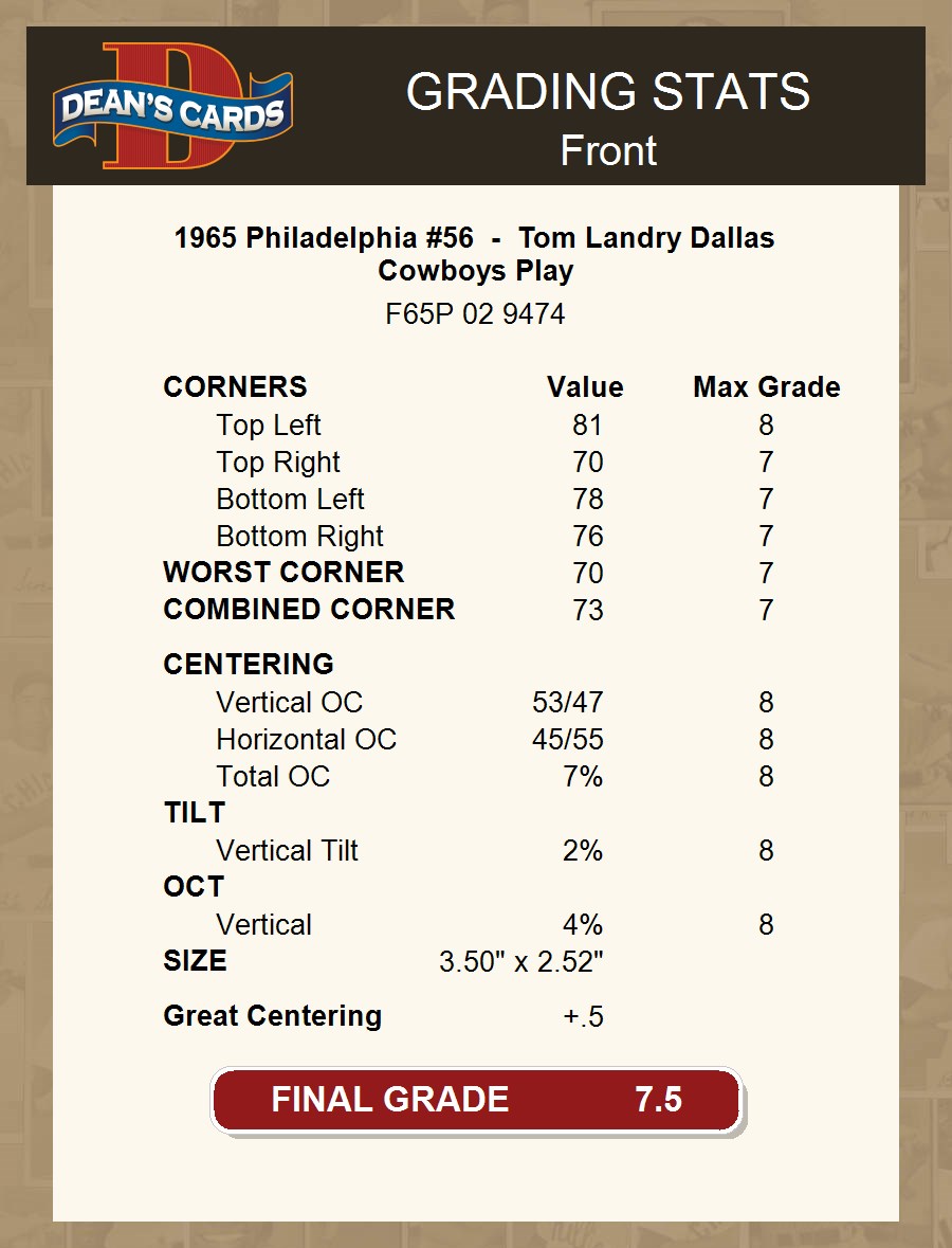 1965 Philadelphia #56 - Tom Landry Dallas Cowboys Play 7.5 - NM+