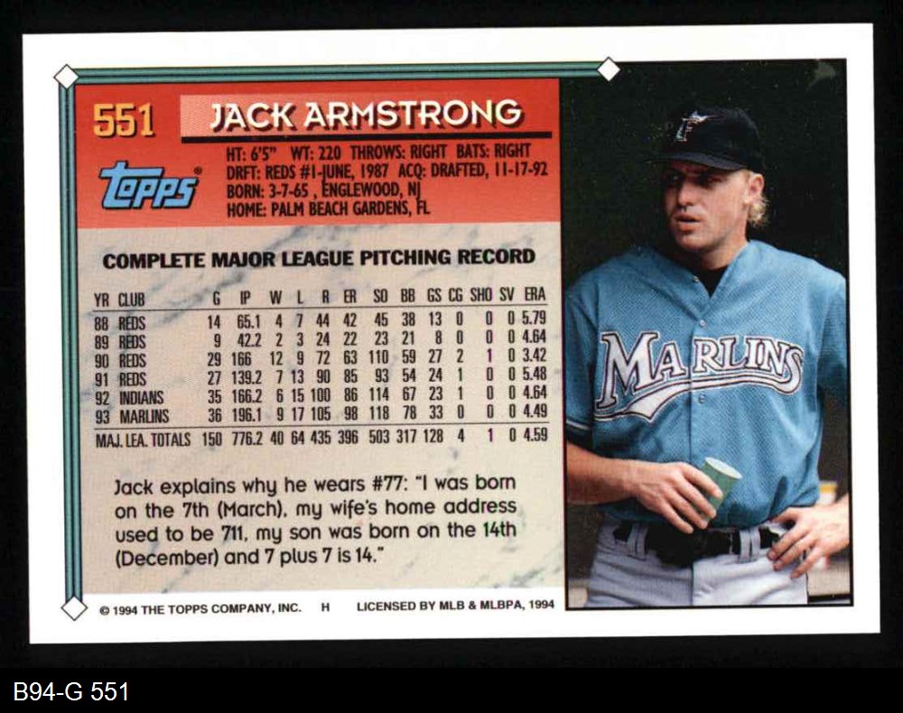 1994 Topps #551 Jack Armstrong 8 - NM/MT