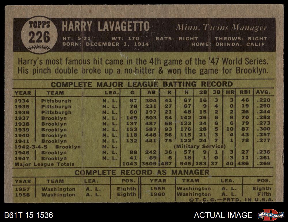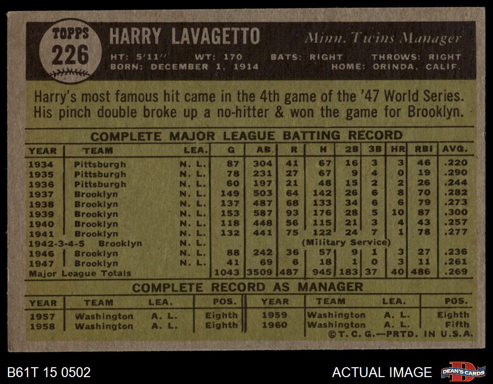 1961 Topps #226 Harry Lavagetto 4 - VG/EX