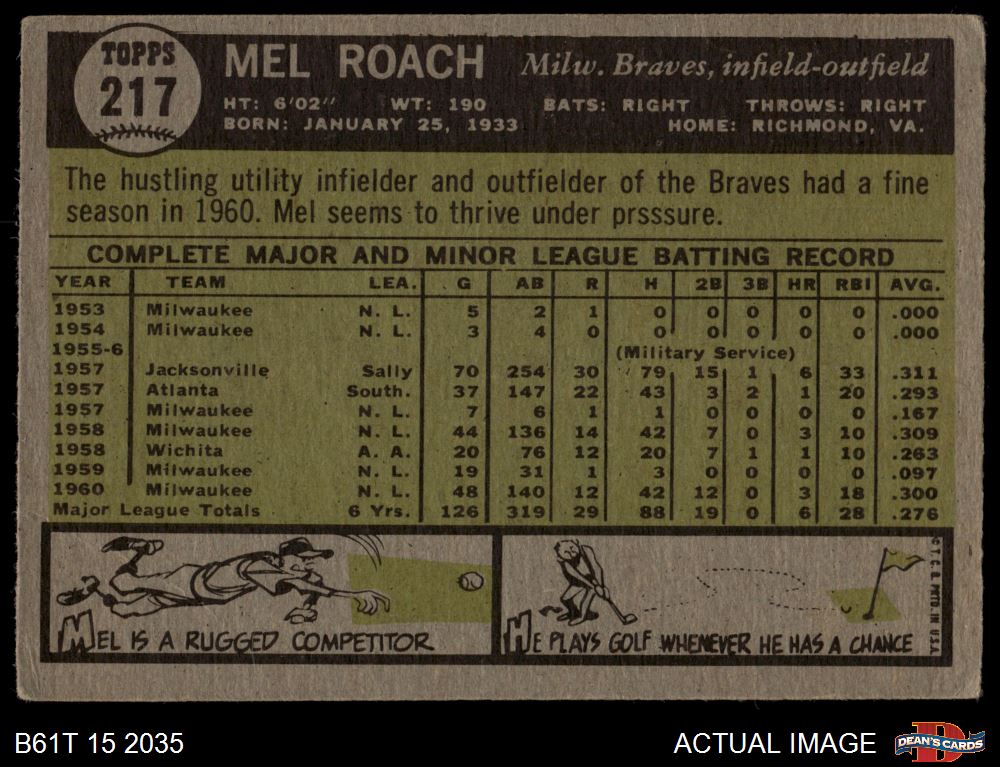 1961 Topps #217 Mel Roach 3 - VG