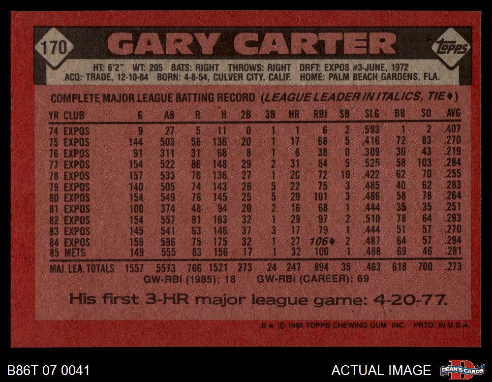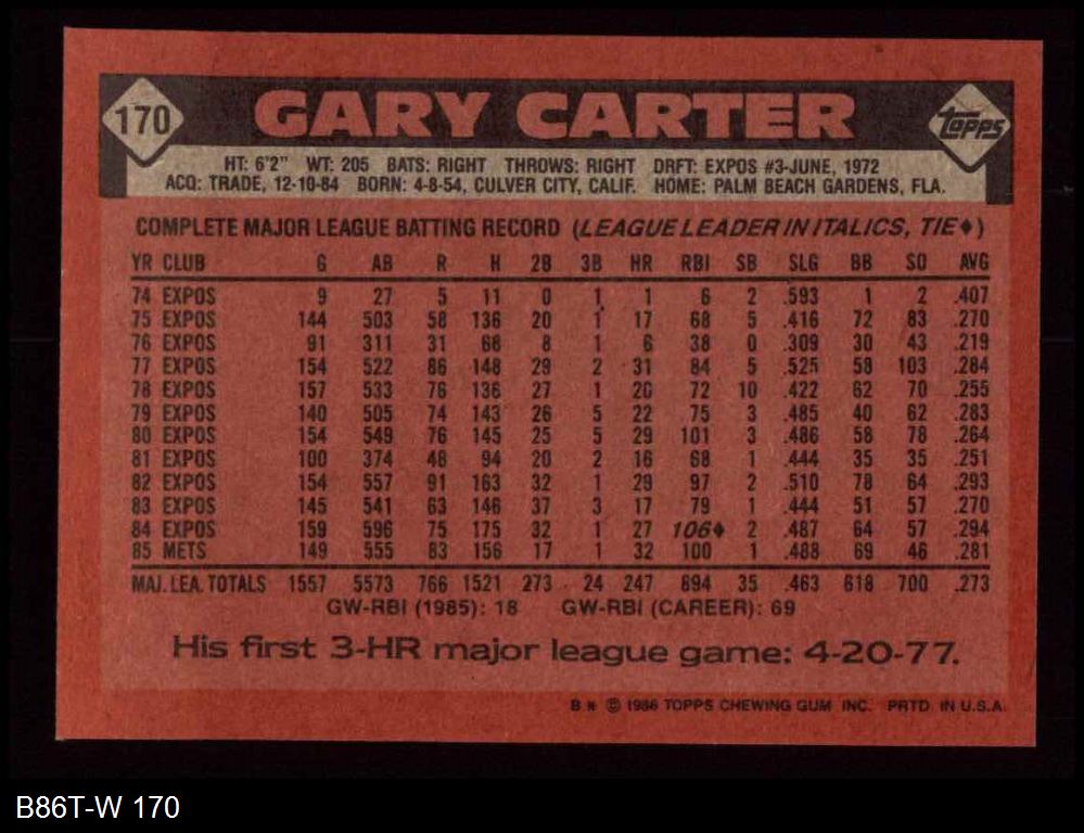 1986 Topps #170 Gary Carter 8 - NM/MT