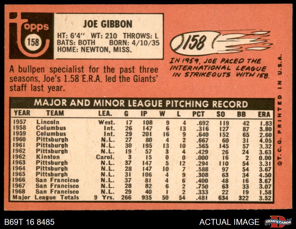 1969 Topps #158 Joe Gibbon 6 - EX/MT