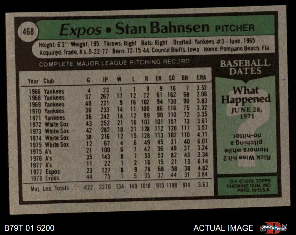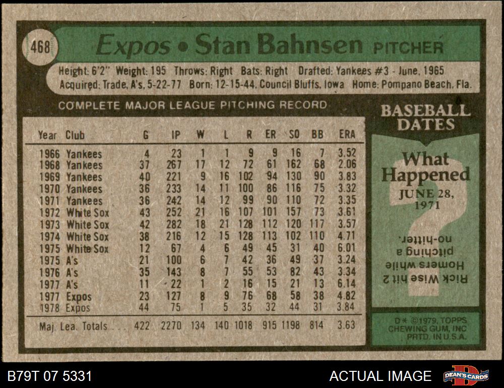 1979 Topps #468 Stan Bahnsen 4 - VG/EX