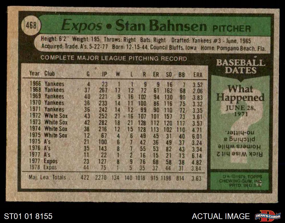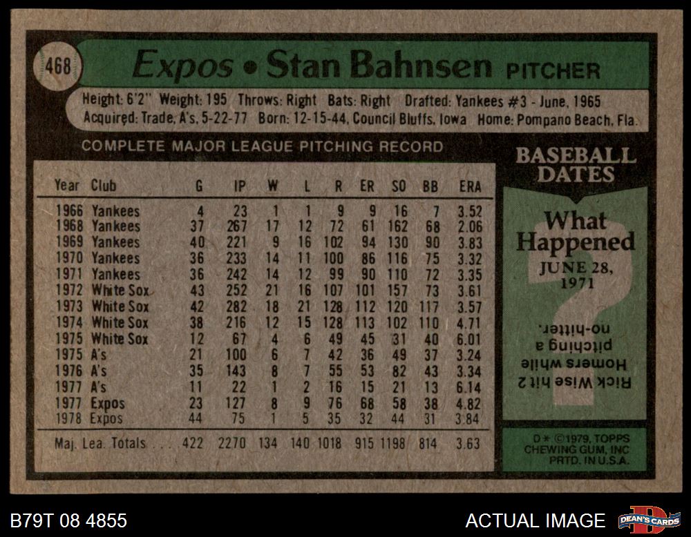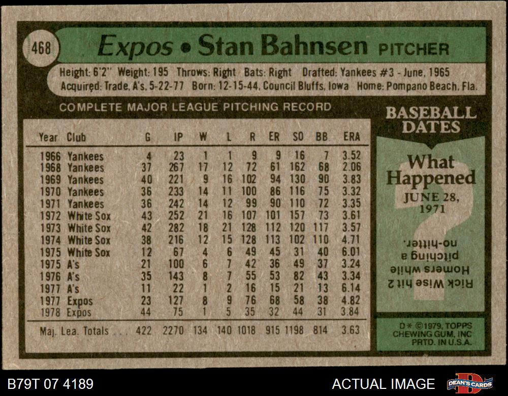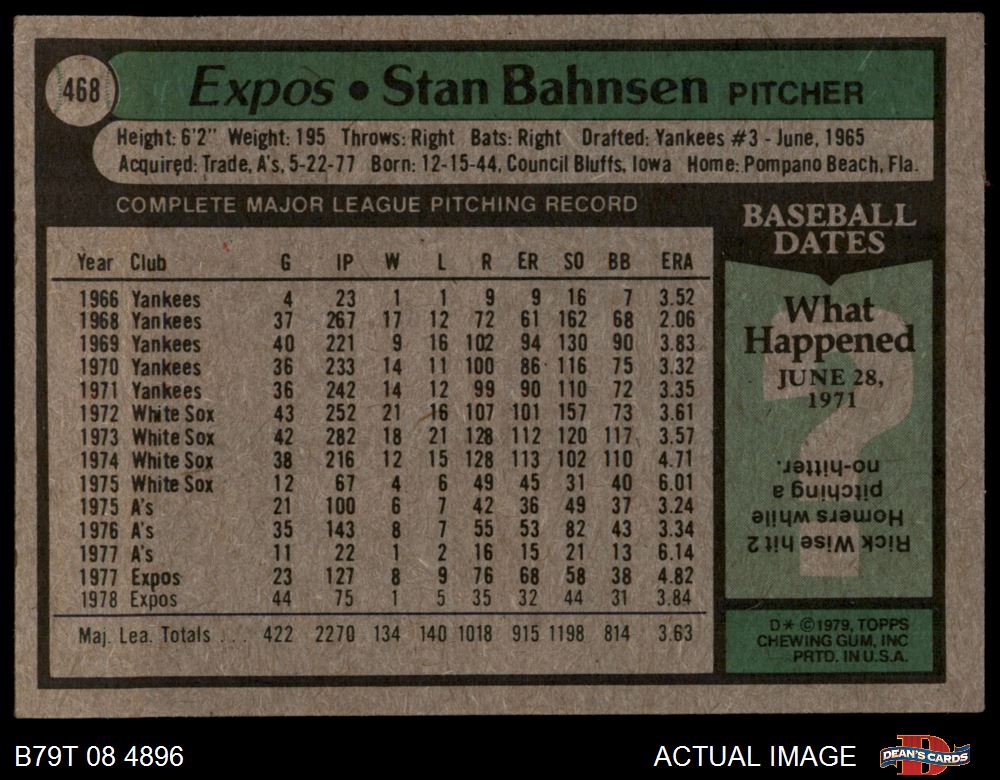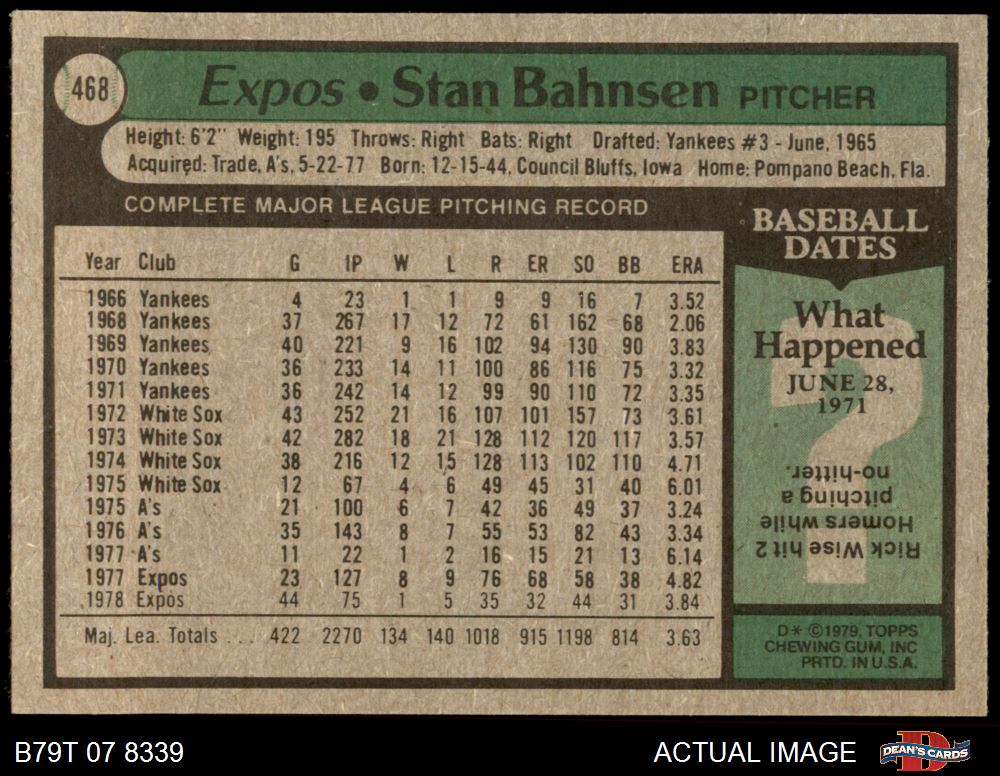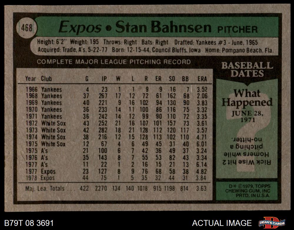 1979 Topps #468 Stan Bahnsen 5 - EX