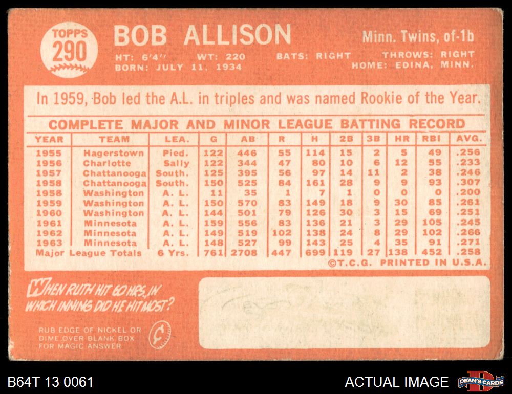 1964 Topps #290 Bob Allison 2.5 - GD+
