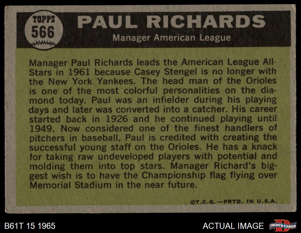 1961 Topps #566 - Paul Richards All-Star 3 - VG