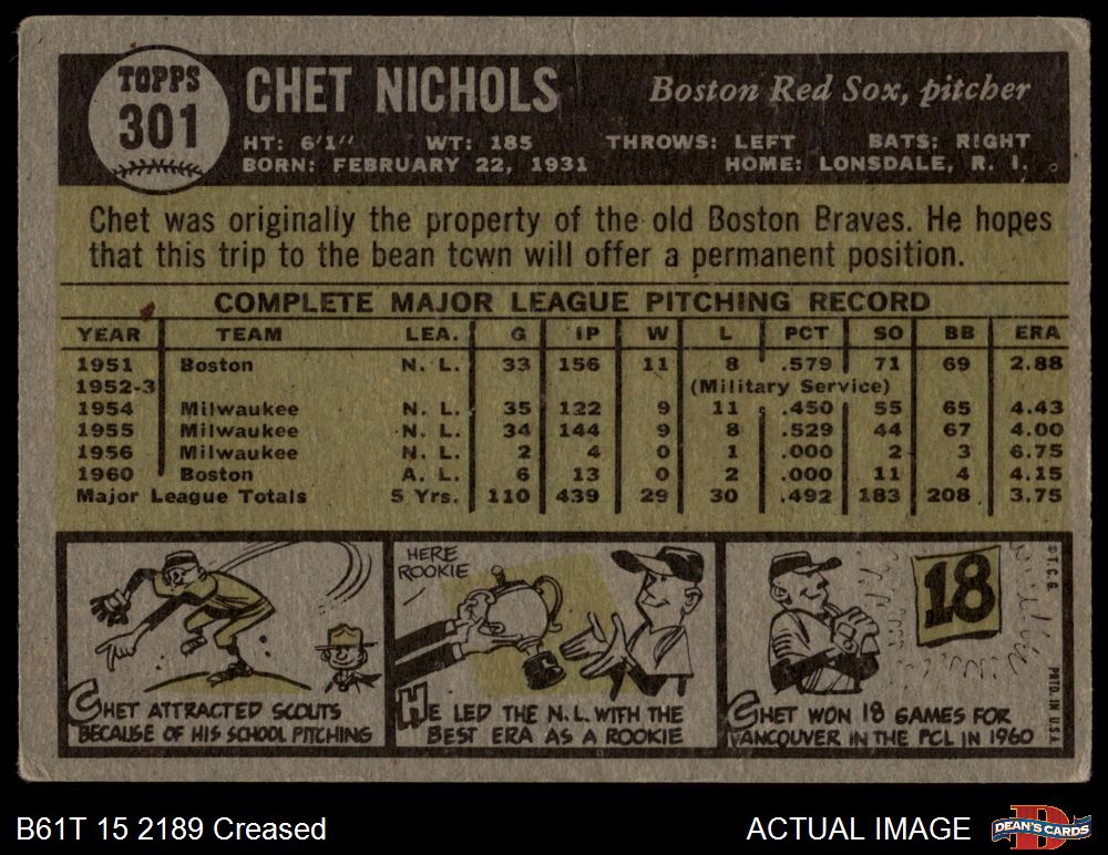 1961 Topps #301 Chet Nichols 2 - GOOD