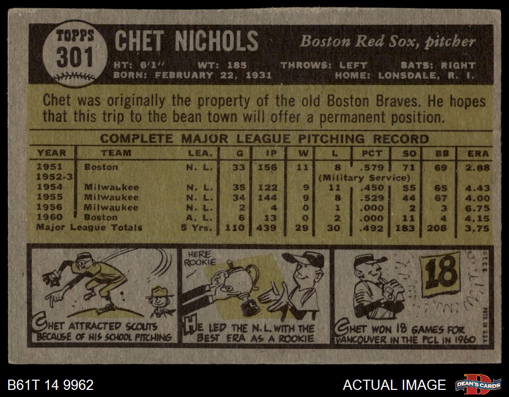 1961 Topps #301 Chet Nichols 4 - VG/EX