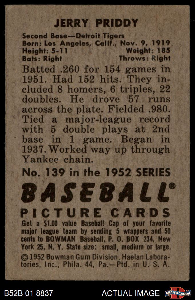 1952 Bowman #139 Jerry Priddy 4 - VG/EX