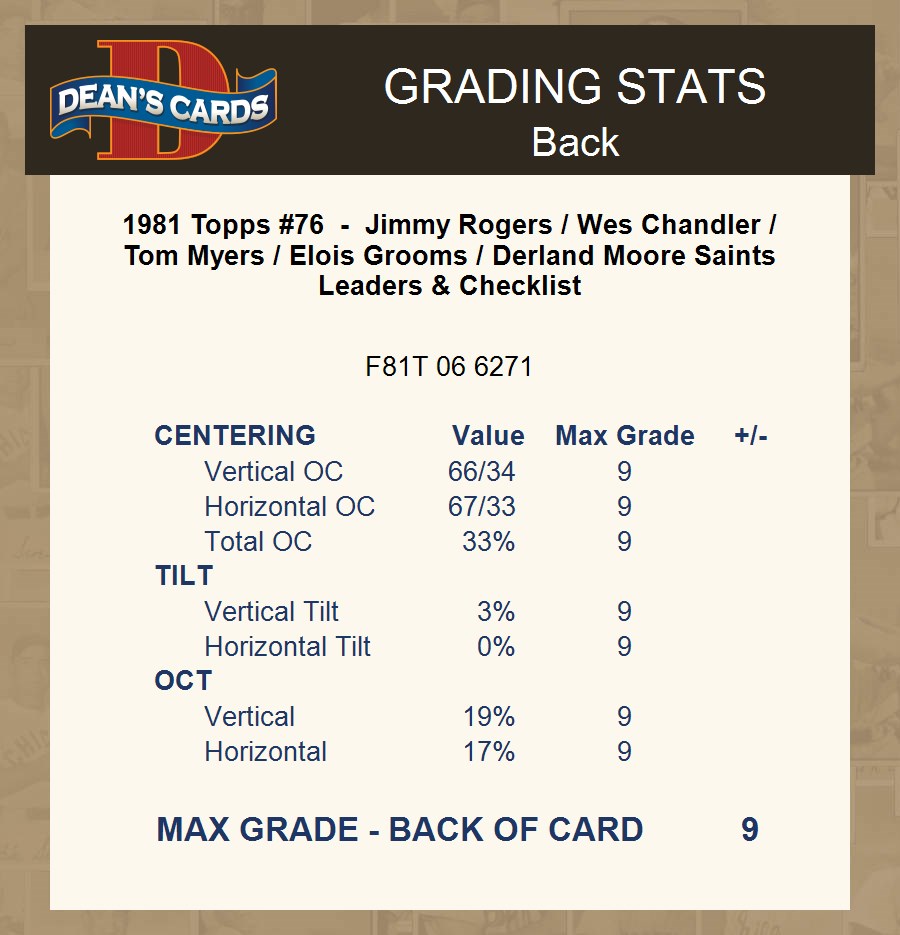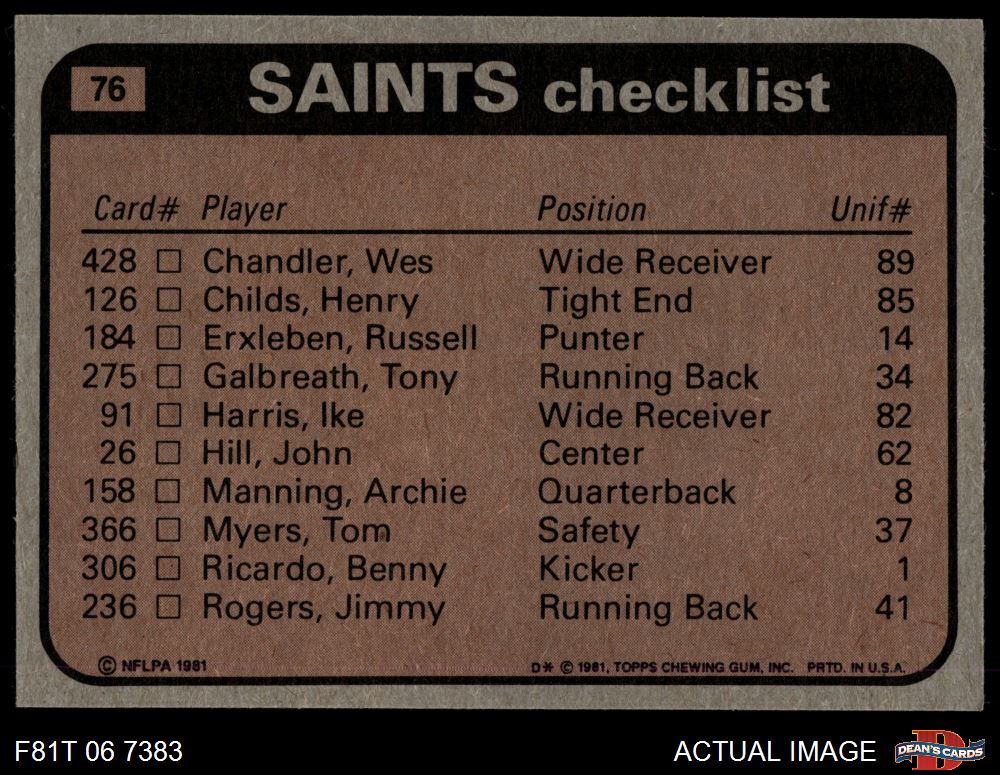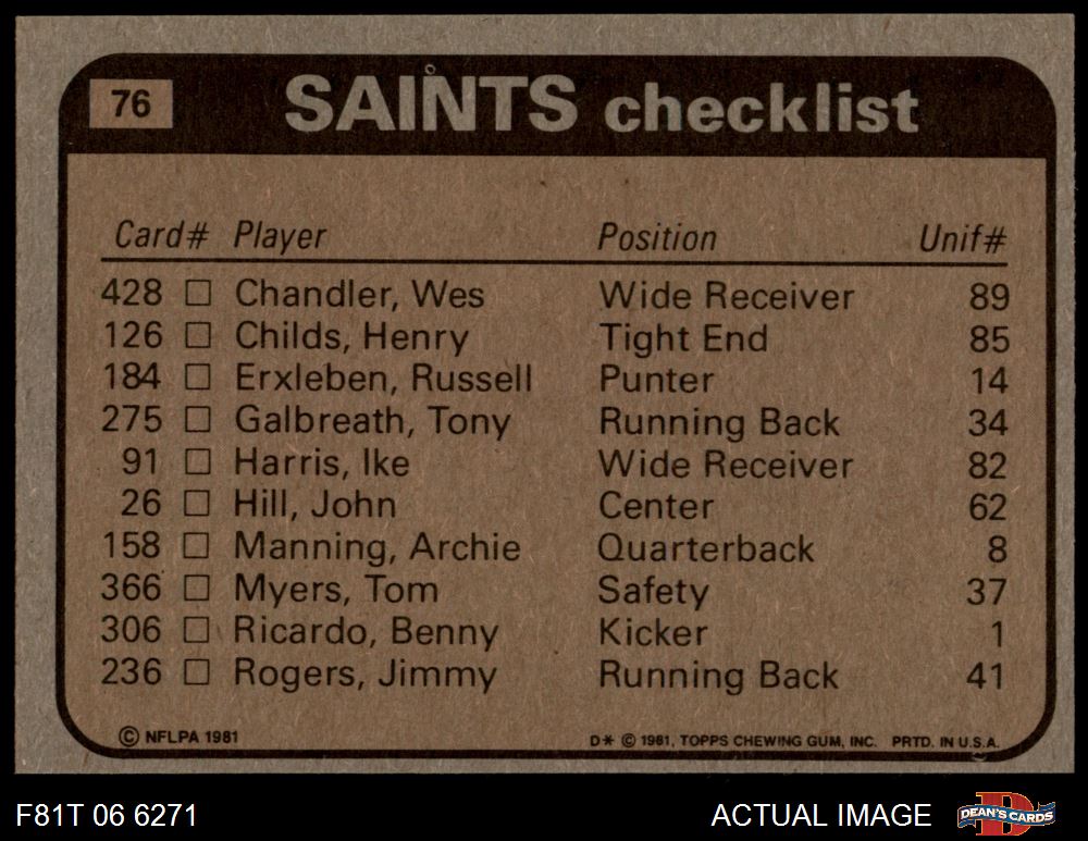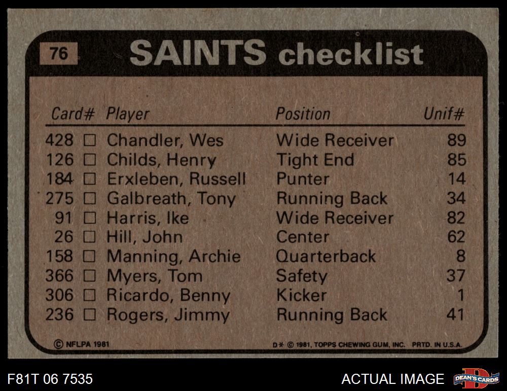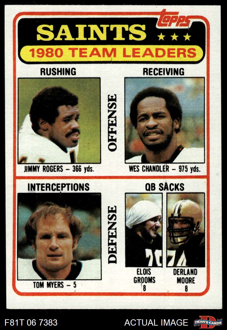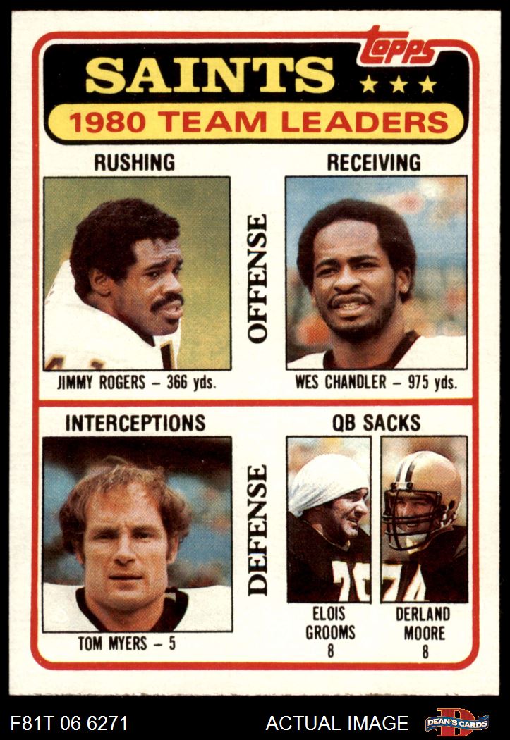 1981 Topps #76 - Jimmy Rogers / Wes Chandler / Tom Myers / Elois Grooms / Derland Moore Saints Leaders & Checklist 7 - NM