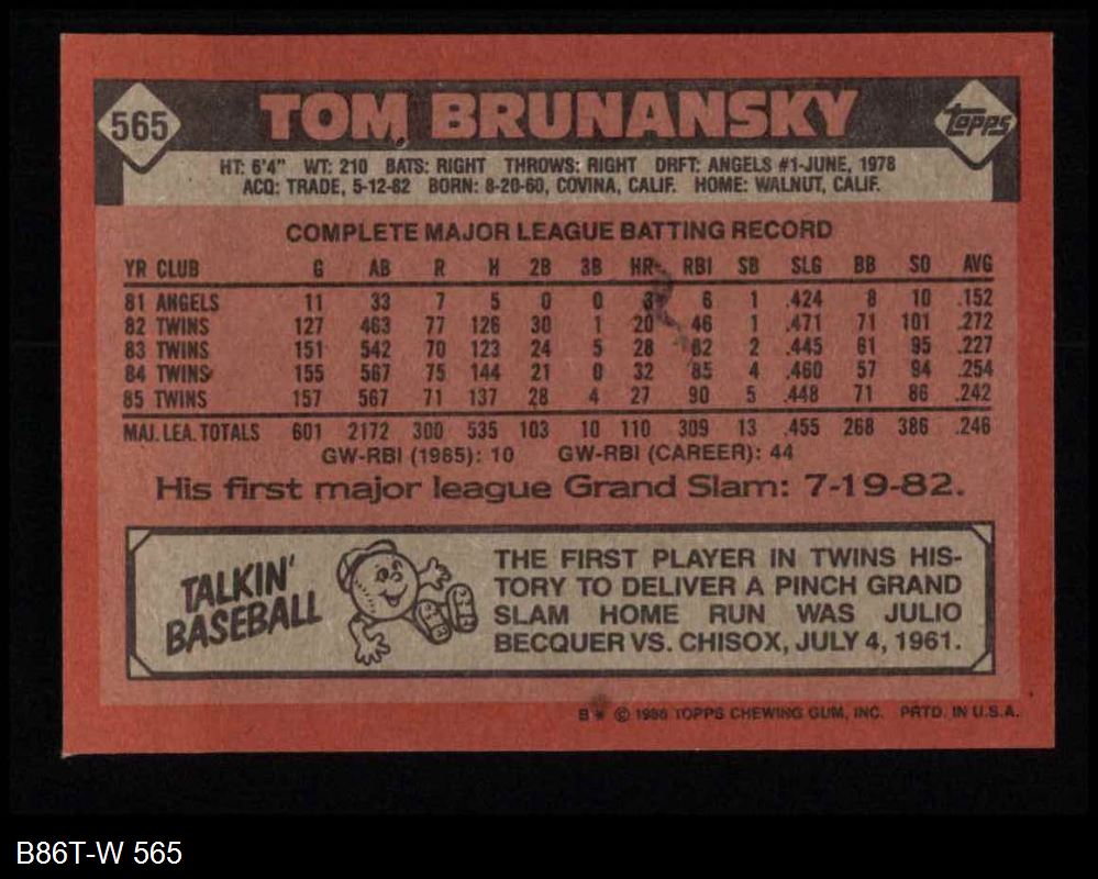 1986 Topps #565 Tom Brunansky 8 - NM/MT