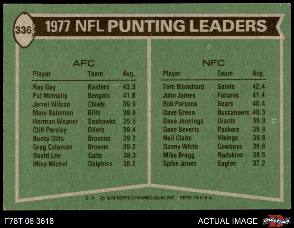 1978 Topps #336 - Ray Guy / Tom Blanchard Punting Leaders 6 - EX/MT