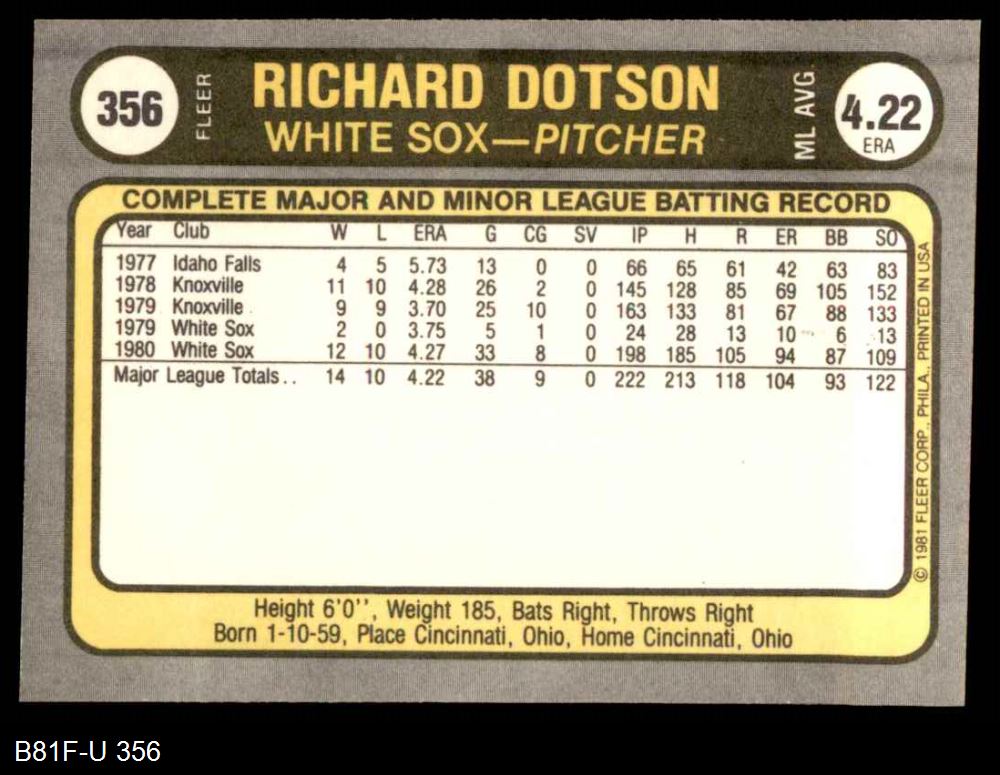 1981 Fleer #356 Richard Dotson 8 - NM/MT
