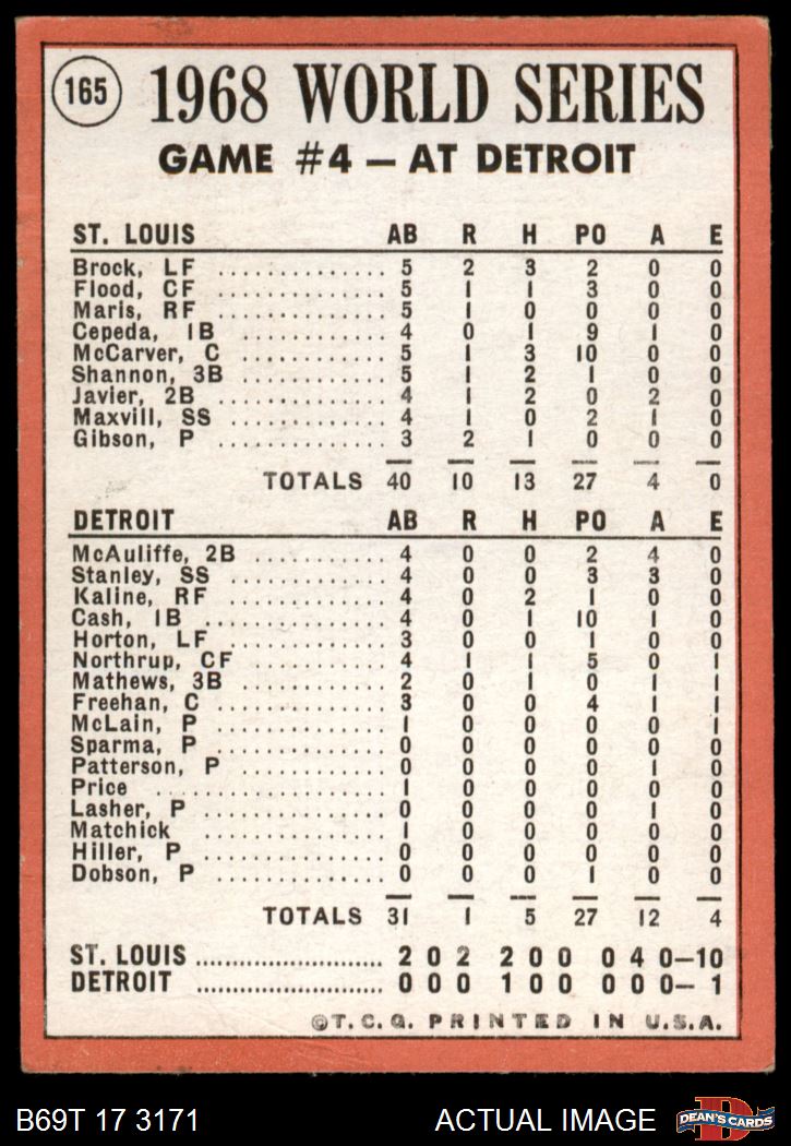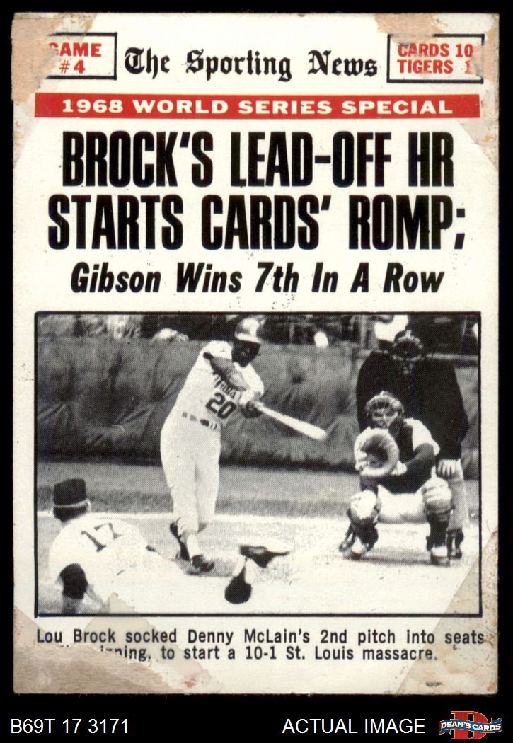 1969 Topps #165 - Lou Brock / Denny McLain / Bill Freehan 1968 World Series - Game #4 - Brock's Lead Off HR Starts Cards Romp AUTHENTIC