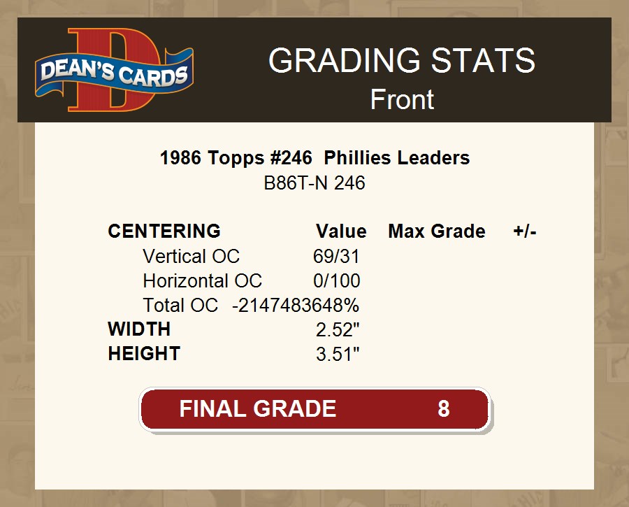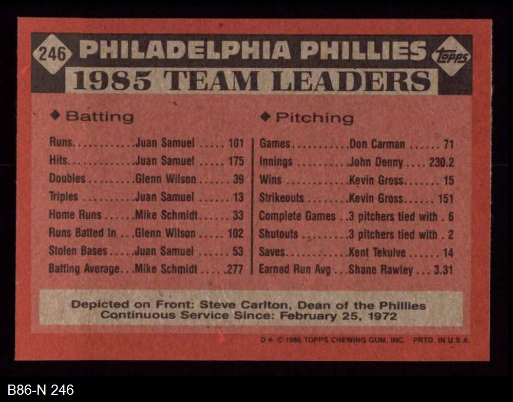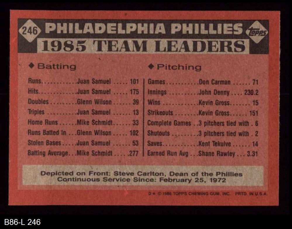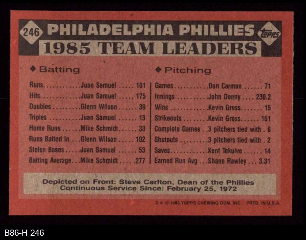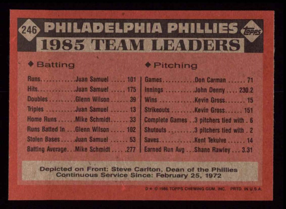 1986 Topps #246 Phillies Leaders 8 - NM/MT