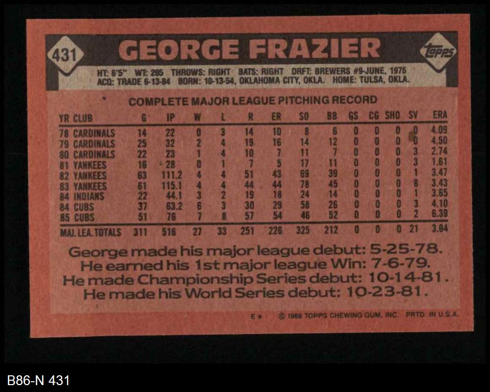 1986 Topps #431 George Frazier 8 - NM/MT