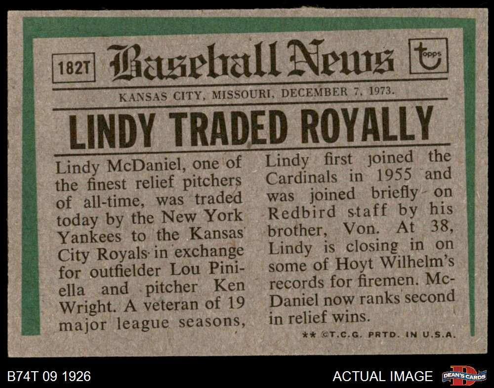 1974 Topps Traded #182 T - Lindy McDaniel Traded 5 - EX