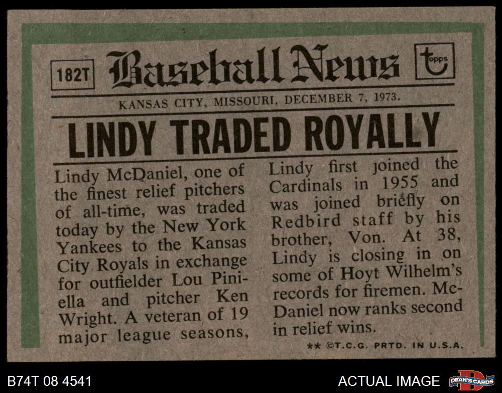 1974 Topps Traded #182 T - Lindy McDaniel Traded 6 - EX/MT