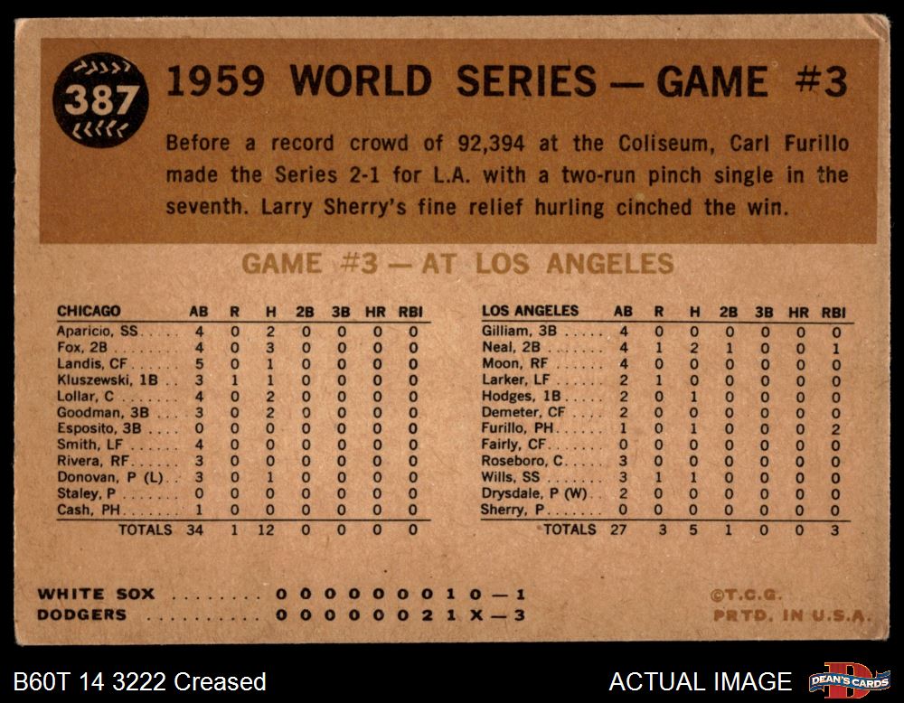 1960 Topps #387 1959 World Series - Game #3 - Furillo Breaks Up Game
