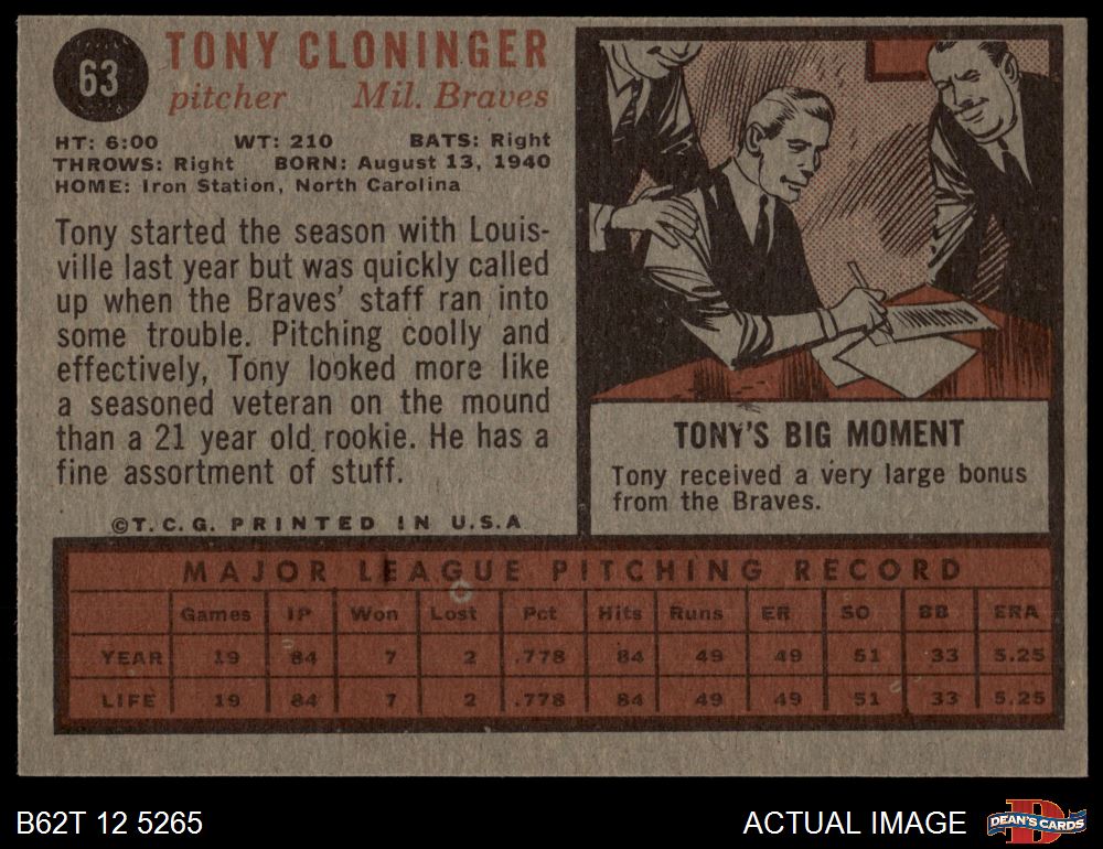 1962 Topps #63 Tony Cloninger