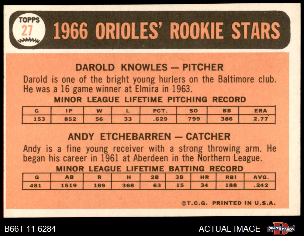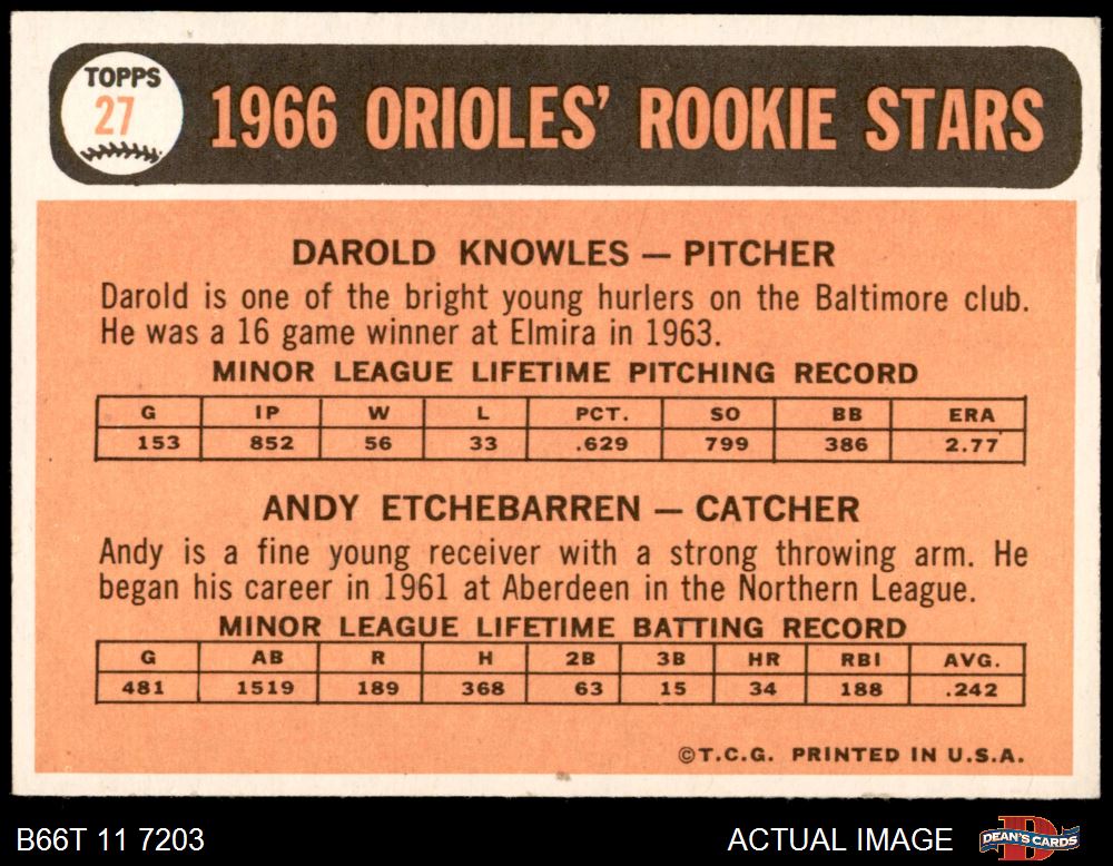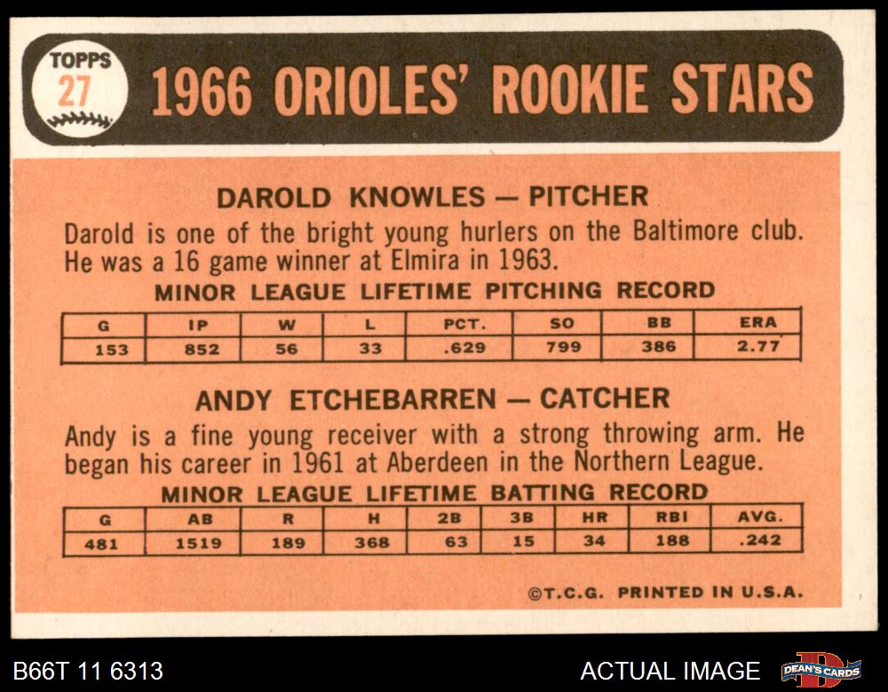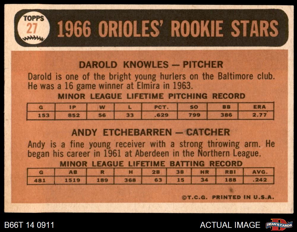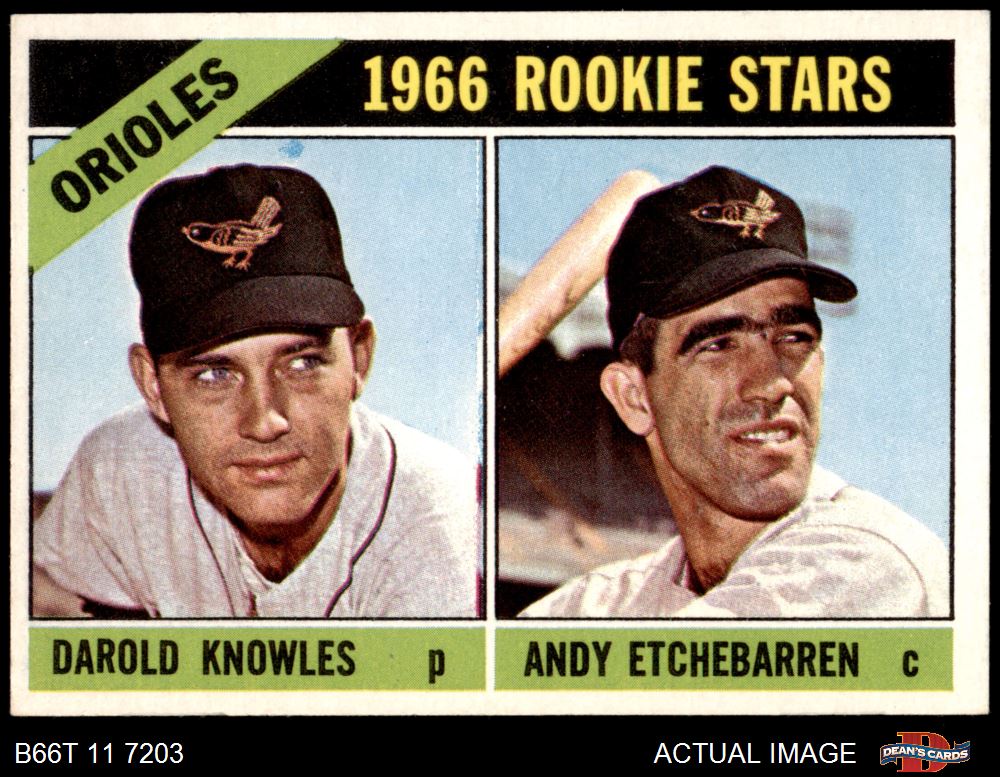 1966 Topps #27 - Andy Etchebarren / Darold Knowles Orioles Rookies 7 - NM