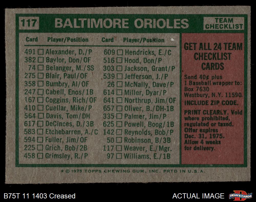 1975 Topps #117  -  Earl Weaver Orioles Team Checklist Front Thumbnail
