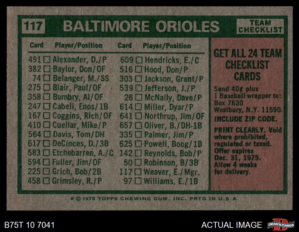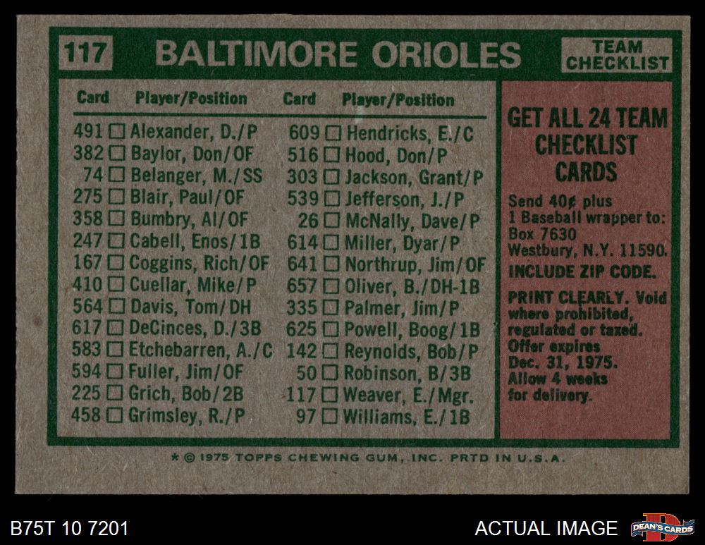 1975 Topps #117 - Earl Weaver Orioles Team Checklist 5 - EX
