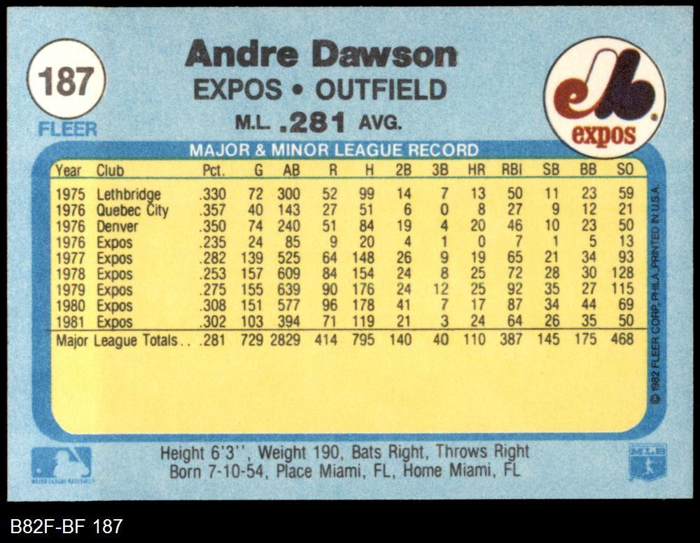 1982 Fleer #187 Andre Dawson 8 - NM/MT