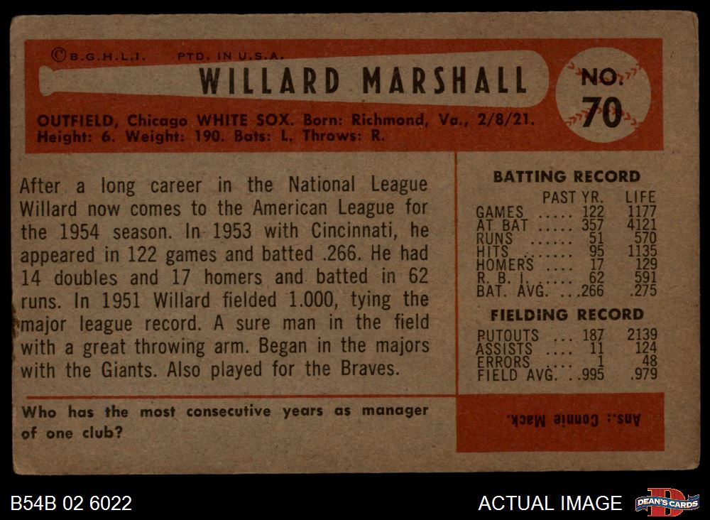 1954 Bowman #70 Willard Marshall 2 - GOOD