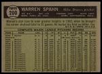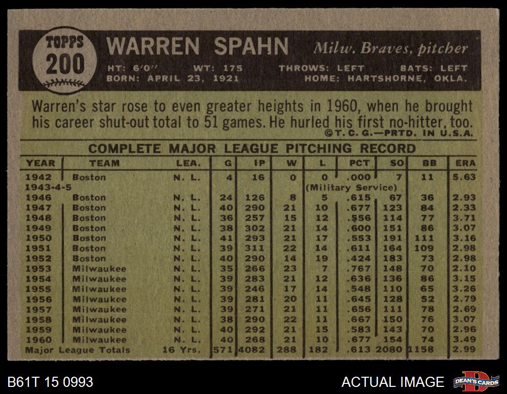 1961 Topps #200 Warren Spahn 4 - VG/EX