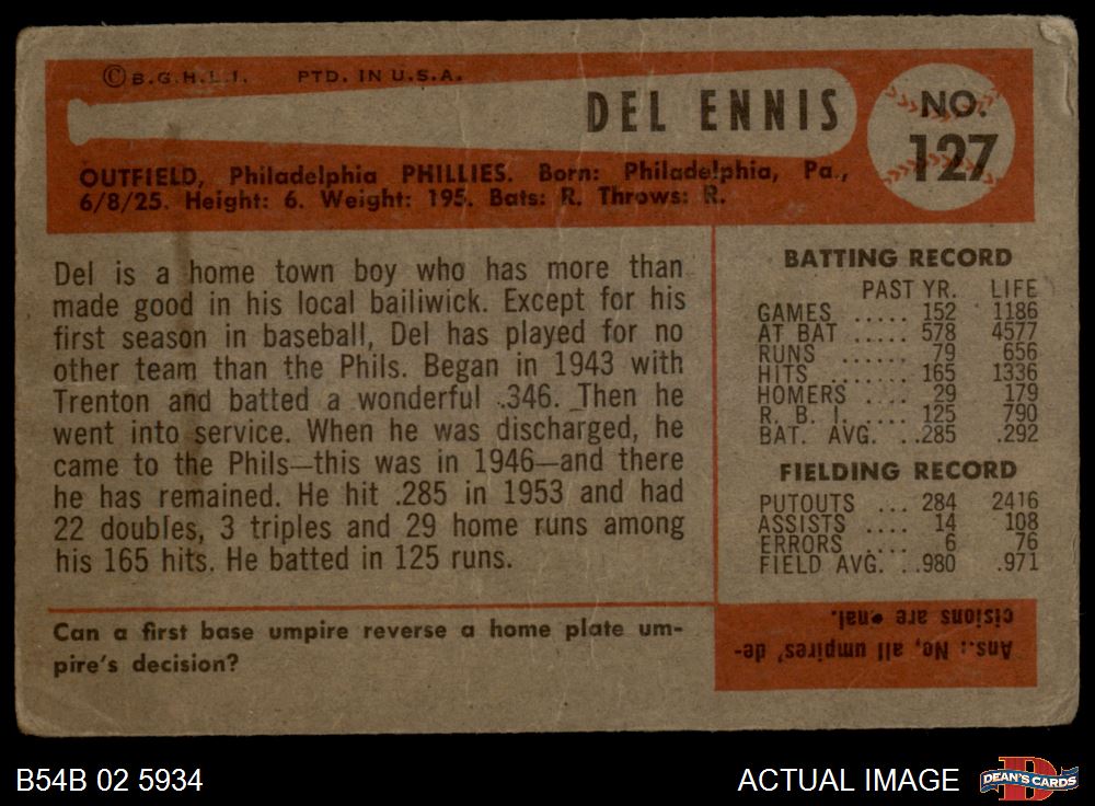 1954 Bowman #127 Del Ennis 1 - POOR