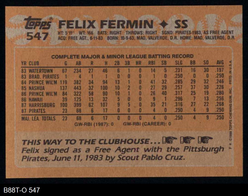 1988 Topps #547 Felix Fermin 8 - NM/MT
