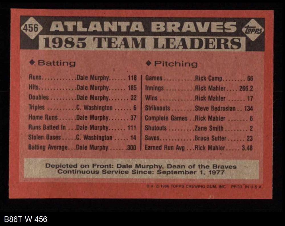 1986 Topps #456 Braves Leaders 8 - NM/MT