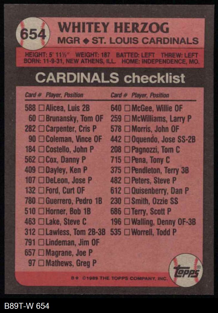 1989 Topps #654 Whitey Herzog 8 - NM/MT