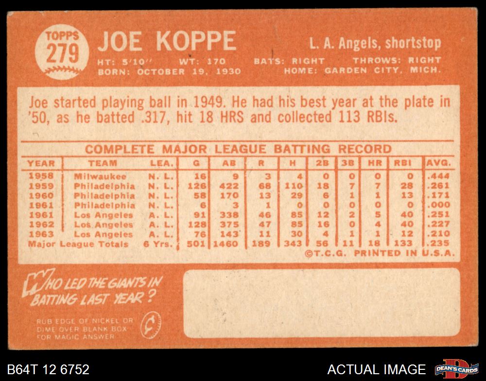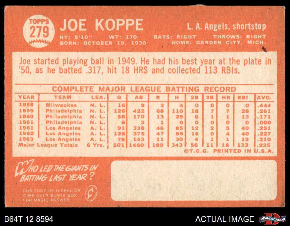 1964 Topps #279 Joe Koppe 3 - VG