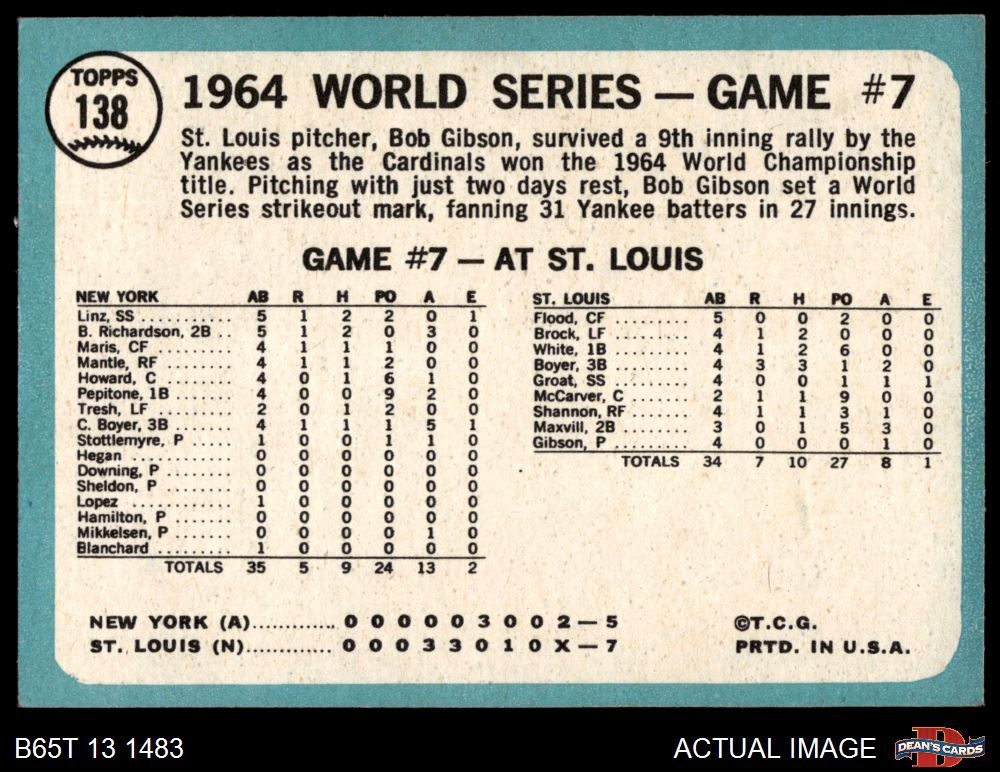 1965 Topps #138 - Bob Gibson 1964 World Series - Game #7 - Gibson Wins Finale 4 - VG/EX