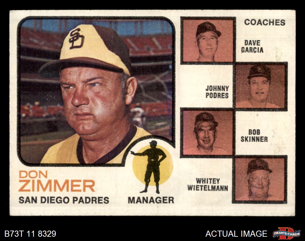 1973 Topps #12 EAR - Don Zimmer / Dave Garcia / Johnny Podres / Bob Skinner / Whitey Wietelmann Padres Leaders 4 - VG/EX