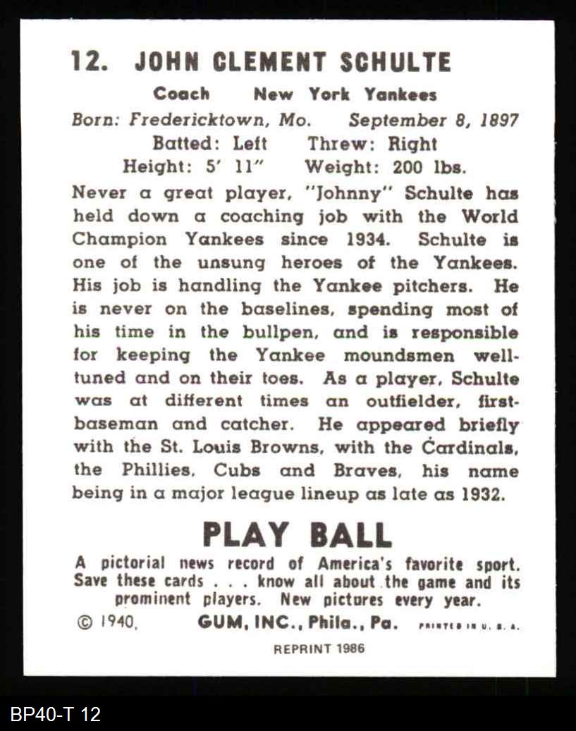 1940 Play Ball Reprint #12 John Schulte 8 - NM/MT