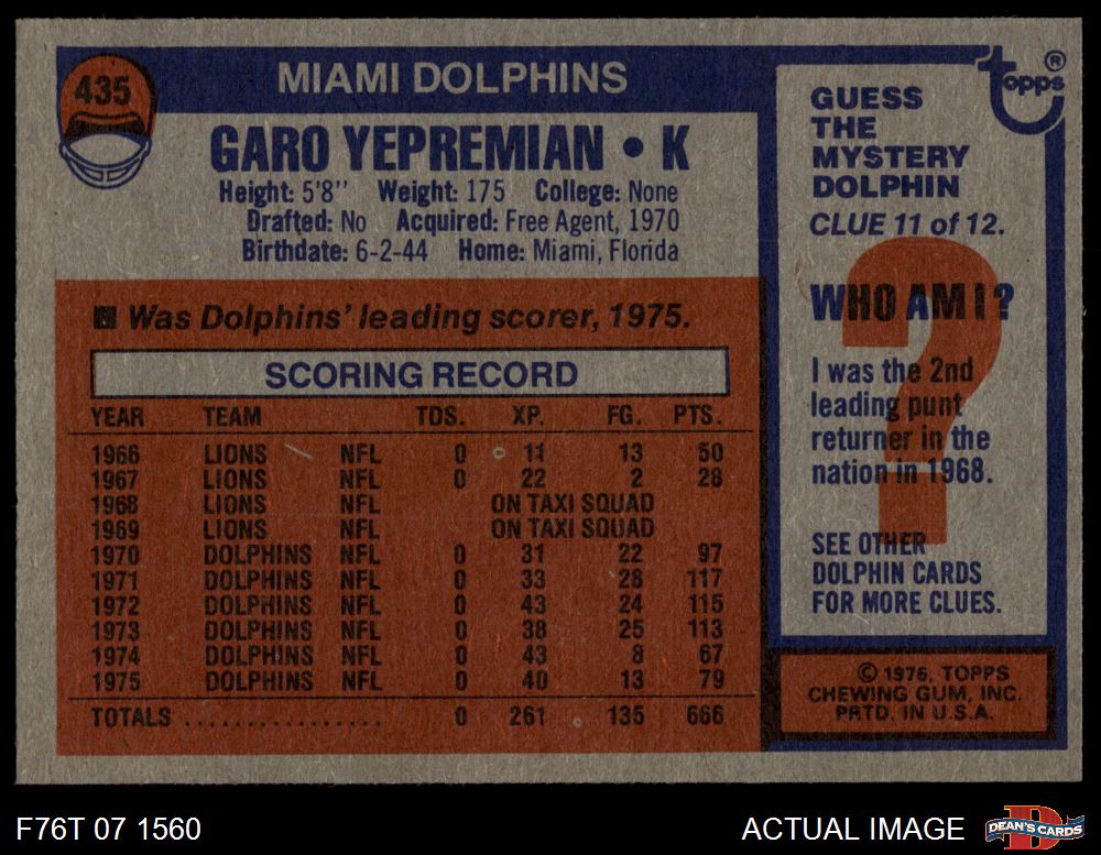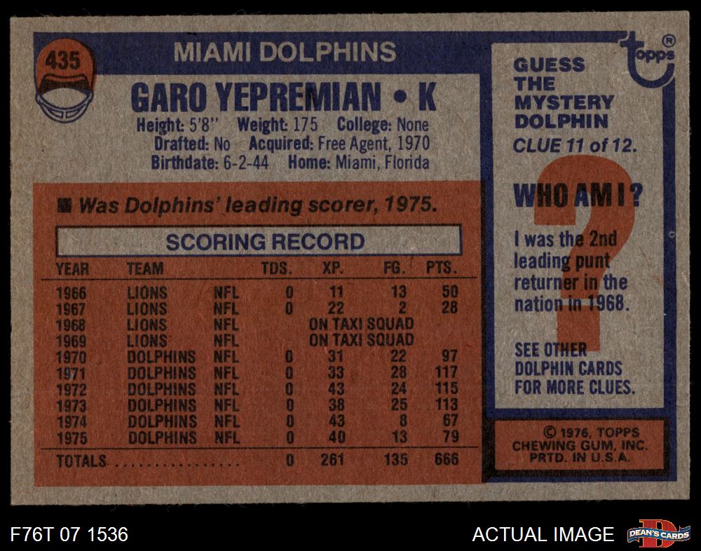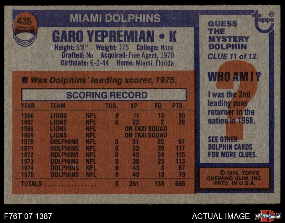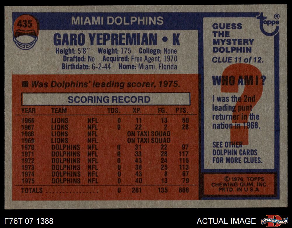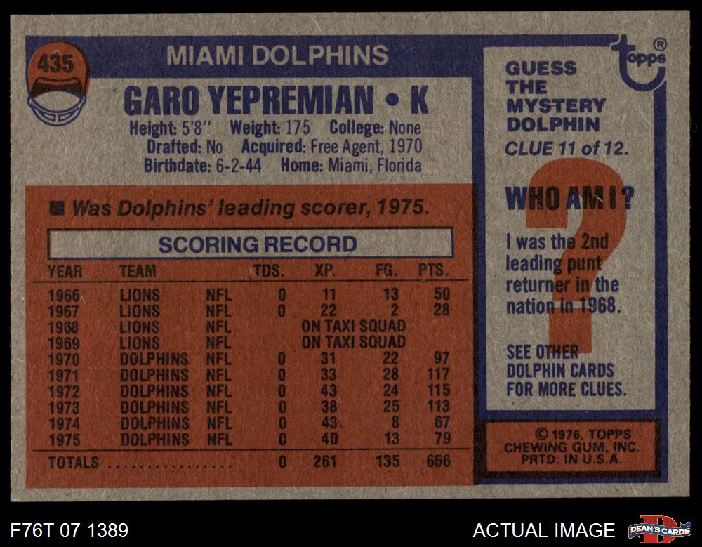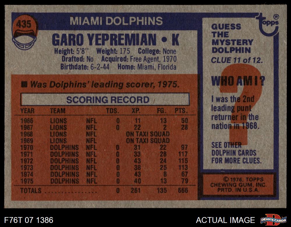 1976 Topps #435 Garo Yepremian