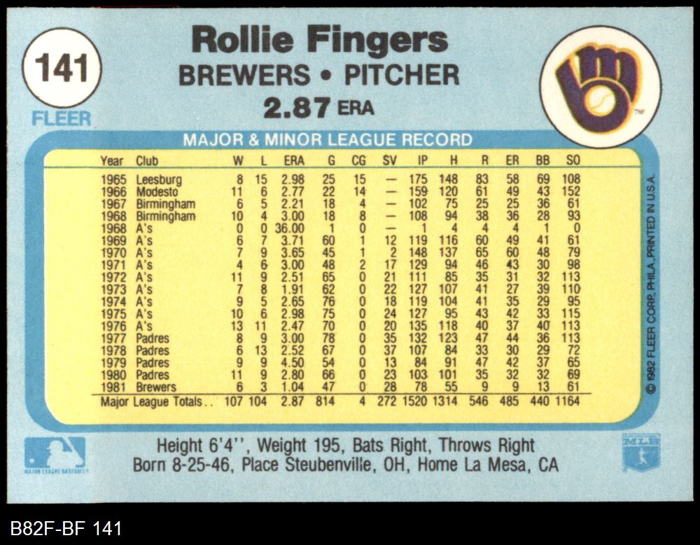 1982 Fleer #141 Rollie Fingers 8 - NM/MT