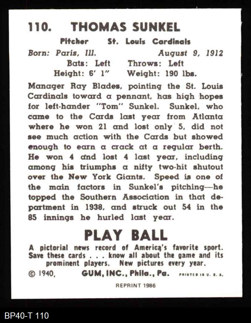 1940 Play Ball Reprint #110 Tom Sunkel 8 - NM/MT